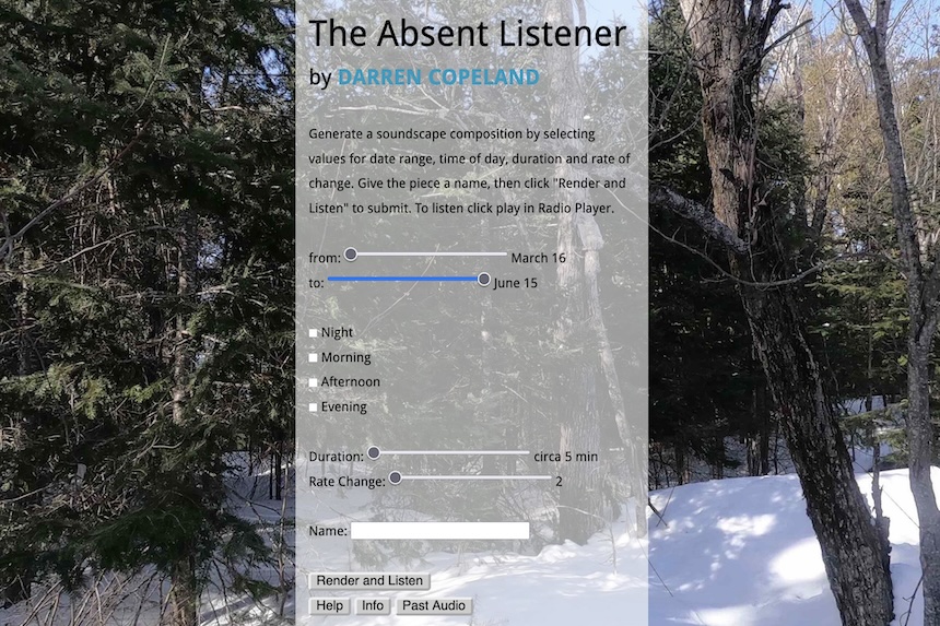 An online audio installation version of The Absent Listener premiered in May 2021 at the Re: Flux Festival in Moncton, New Brunswick. In this version, online listeners generated compositions for later listening by choosing from a small set of parameters – dates of recording, time of day, duration and degree of recording variance.